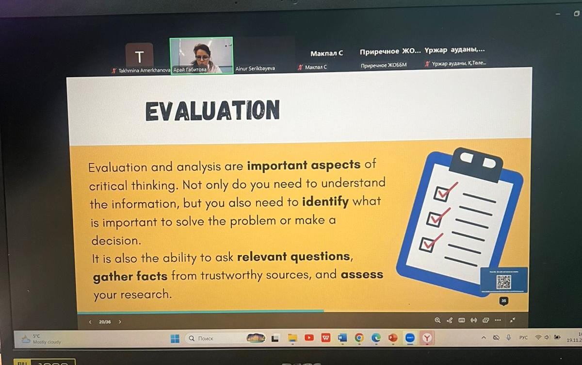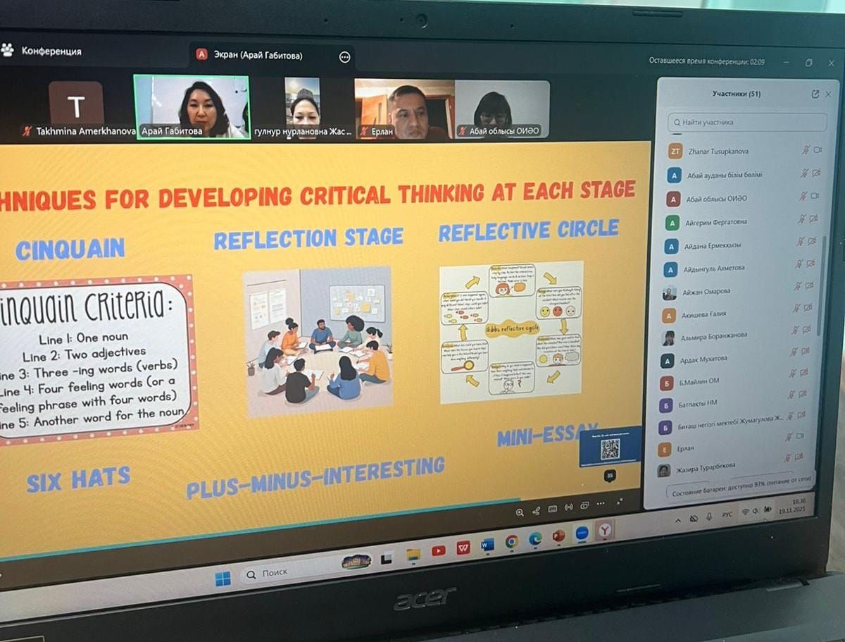 Вебинар барысында мұғалімдер өздерінің кәсіби тәжірибелерімен белсенді бөлісті, тиімді оқыту әдістерін талқылады және өз педагогикалық қызметтерінен практикалық мысалдармен бөлісті. Мұғалімдер талдау, салыстыру, дәлелдеу және шығармашылық мәселе шешу тапсырмалары арқылы оқушыларда сыни ойлау дағдыларын қалыптастыруға болатынын, сонымен қатар олардың тілдік құзыреттілігін дамытатынын көрсетті.