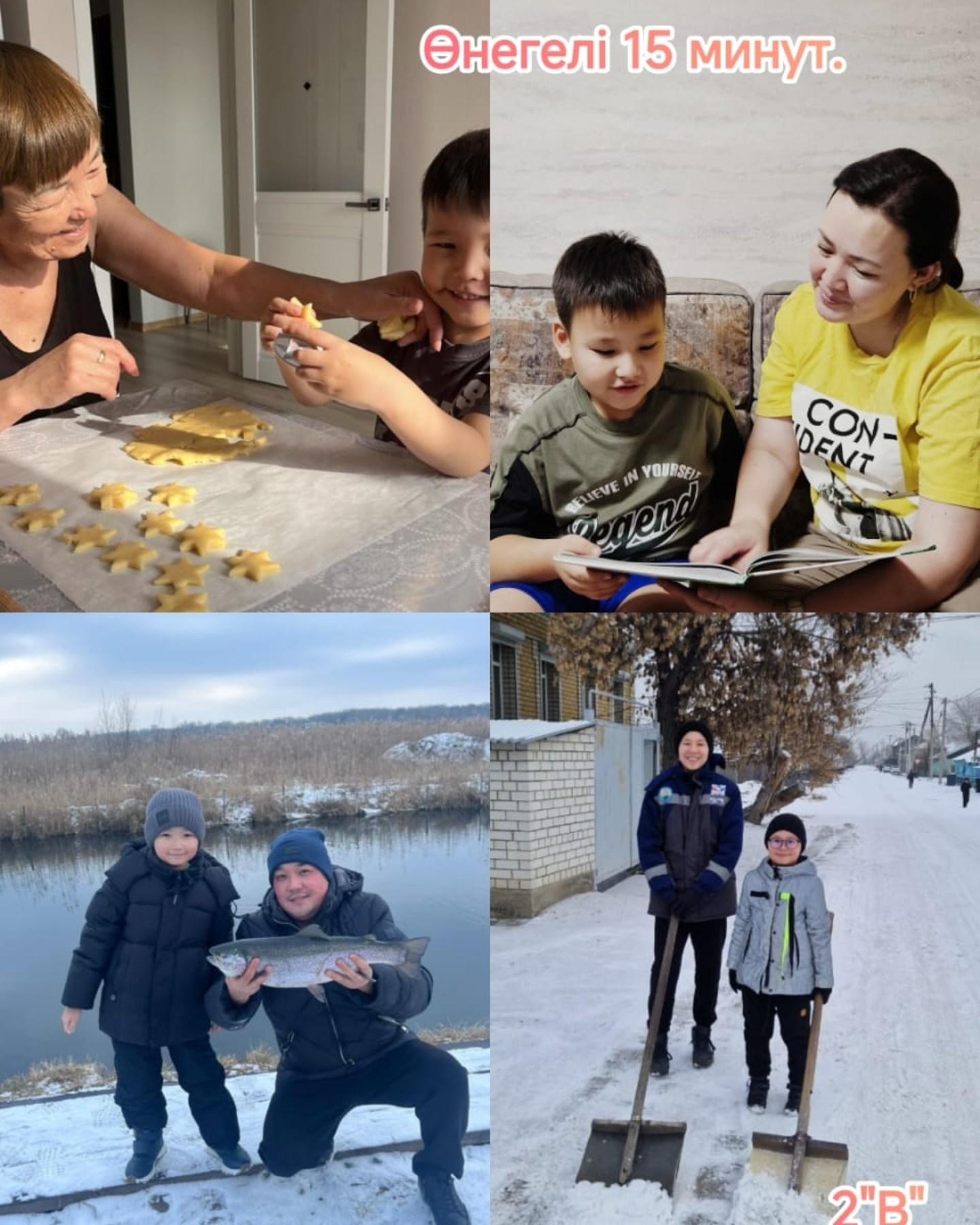 Учащиеся 2"в" класса поучаствовали в акции "Образцовые 15 минут" Вместе с родителями весело и полезно провели время: тренировались, читали, пекли печенье и пиццу,  убирали снег во дворе и даже сходили на рыбалку!