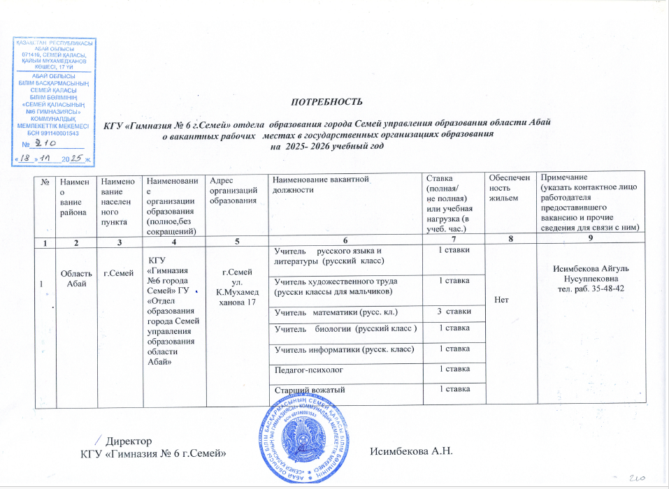 Коммунальное государственное учреждение «Гимназия № 6 г. Семей» отдела образования  города Семей управления образования области Абай объявляет конкурс на вакантную  должность